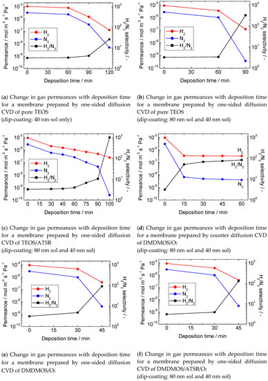 To further improve the H2 permeance, the silica precursor was changed from TEOS to DMDMOS. Figure 6d shows the results for the membrane prepared by counter diffusion CVD of DMDMOS and O2. In this case, the membrane fabrication was mostly finished within the first 15 min. After that, the H2 permeance became almost constant, whereas the N2 permeance still decreased slowly, probably because of the modification of some small remaining pores. It is evident that thermal decomposition of DMDMOS was almost negligible, and it actually needed the presence of O2 to form a SiO2 film. After 60 min of CVD, the H2 permeance and the H2/N2 selectivity at 500 °C were 3.3 × 10−7 mol m−2 s−1 Pa−1 and 82, respectively. Considering the fact that the measurement was taken at 500 °C, the H2 permeance was already much higher than that for a TEOS-derived membrane, but it was not as high as the literature value (9.0 × 10−7 mol m−2 s−1 Pa−1) [17]. Figure 6e shows the results for the membrane prepared by one-sided diffusion CVD of DMDMOS and O2. After 45 min of CVD, the H2 permeance and the H2/N2 selectivity at 500 °C were 3.8 × 10−7 mol m−2 s−1 Pa−1 and 90, respectively. Finally, Figure 6f shows the results of the membrane prepared by one-sided diffusion CVD of DMDMOS/ATSB/O2. After 45 min of CVD, the H2 permeance and the H2/N2 selectivity at 500 °C were 4.0 × 10−7 mol m−2 s−1 Pa−1 and 130, respectively.