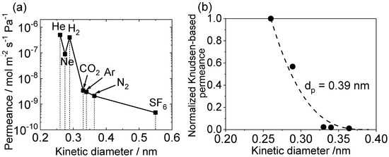 The data for the different gases (Figure 7a) can be analyzed by a normalized Knudsen-based permeance method [20]. The method is derived from the gas translation model. First, the gas permeances of the various gases with different kinetic diameters were converted to normalized Knudsen permeances using Equation (5). The obtained results were then plotted as a function of molecular size (Figure 7b). Finally, Equation (6) was used to fit the experimental data, using dp as fitting parameter.