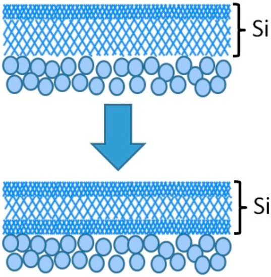 However, unlike the case of membranes prepared by counter-diffusion CVD [41,49], there was no remarkable change in the N2 permeance. This was probably due to the structural difference between the membranes prepared by counter-diffusion CVD and one-sided diffusion CVD. In the former case, the silica film is generally deposited within the pores of γ-alumina, thus the continuity of the silica might be susceptive to the structural change of γ-alumina. In the latter case, a thin silica “layer” is deposited on top of the γ-alumina layer, so pinholes can hardly be created even if the average Kelvin pore diameter of γ-alumina increases by the hydrothermal exposure. Rather than a change of the N2 permeance, a sharp decrease of the H2 permeance was observed again for the first 12 h of exposure. This was probably because of the attack of the H2O molecules on both sides of the silica layer, as shown in Figure 9.