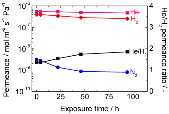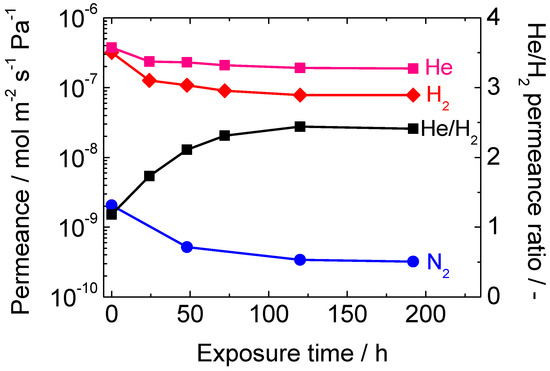 Overall, the H2 permeances of the DMDMOS-derived membranes were not as high as that reported in the literature (9.0 × 10−7 mol m−2 s−1 Pa−1) [17], probably due to the lack of optimization of the CVD parameters. However, the permeance measurements for several gas species (Figure 7a) revealed that the DMDMOS-derived membrane may have a looser silica network compared to the TEOS-derived membranes. The first evidence for this inference is that the He/H2 permeance ratio for the fresh DMDMOS membrane was as low as 1.2. The value was much lower than those for TEOS-derived membranes (usually >2.0), suggesting that the average pore size of the DMDMOS-derived silica network was significantly larger than the kinetic diameters of H2 (0.289 nm) or He (0.26 nm). In fact, the H2 permeance was higher than that for a TEOS-derived membrane, but the He permeance was lower.