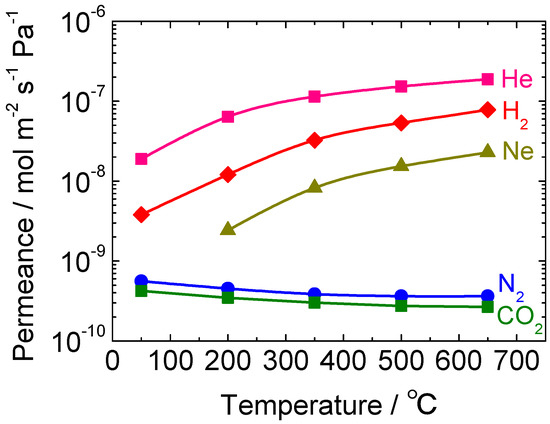 The separation mechanism of small species like He, H2, and Ne in silica membranes prepared by chemical vapor deposition of alkoxide substrates is based on molecular hopping between solubility sites [31]. The sites in the silica network are approximately 0.3 nm, allowing only small gas molecules like He, H2, or Ne to enter them [31,32]. The only way for larger gas molecules to permeate is to pass through pores or defects such as pinholes or cracks. Therefore, the avoidance of defects is important for high H2 selectivity, and this will be one of the topics covered in this study. Permeance in membranes with larger pores may occur by a modified gas translational mechanism [33].