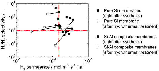Figure 14 shows a summary of the performance of a total number of 16 membranes fabricated in this study, the intermediate layers of which were synthesized by the sequential treatment with an 80 and a 40 nm sol. Even though the synthesis steps were simplified compared to a previous study [35], Si-Al composite membranes with H2 permeance > 1.5 × 10−7 mol m−2 s−1 Pa−1 and H2/N2 selectivity > 100 have been successfully fabricated many times, demonstrating the level of reproducibility of the membrane fabrication process used in this study. There are many steps that enter into the synthesis, including joining of the support to the dense alumina tubes, the preparation of the sols, the dip-coating procedure, and the CVD process, and it is difficult to control all the steps. Nevertheless, the results are significant as the values of H2 permeance > 1.5 × 10−7 mol m−2 s−1 Pa−1 and H2/N2 selectivity > 100 noted above were shown to be requirements for a commercial process [36]. This involved the study of the model A → B + C reaction, the dihydrogen-ation of ethane (C2H6 → C2H4 + H2) over a 5 wt% Cr/ZSM-5 catalyst in a conventional packed-bed reactor (PBR) and in a membrane reactor (MR) fitted with hydrogen-selective silica membranes. Specifically, it was demonstrated that for the all-important permeance range of 10−7 and 10−6 mol m−2 s−1 Pa−1, there was an enhancement in yield as H2 selectivity increased from 10 to 20 and 30, but beyond 100, there was little improvement even with a selectivity of 1000 [36]. Thus, a selectivity of 100 is sufficient for most applications involving membrane reactors.
