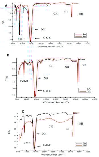 Fourier Transform Infrared spectra of selected chitosan (A) Samples 1A and 1B, (B) Samples 5A and 5B, (c) Samples 9A and 9B.