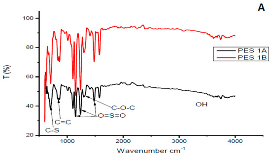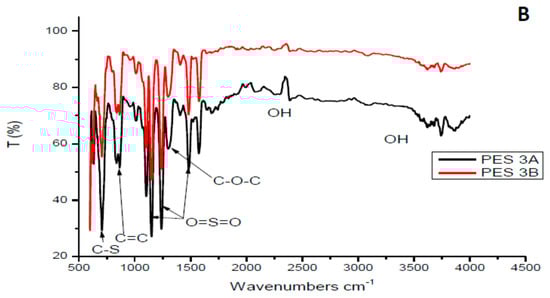 FTIR spectra of selected synthesized PES/chitosan membranes chitosan (A) Samples 1A and 1B, (B) Samples 3A and 3B.