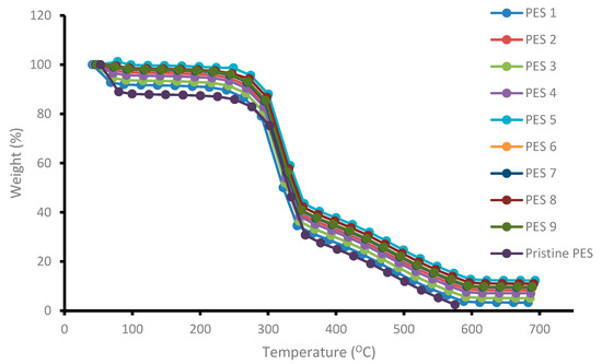 The thermal degradation and stability of the synthesized membranes blended with chitosan having various degree of deacetylation was evaluated and determined using thermogravimetric analyzer. The results are depicted in Figure 4. The general trend observed was that the thermal stability plot showed loss of mass of the membranes with increasing temperature. A three-step degradation process was observed, which were at 65 °C, 302 °C and 350 °C. The rapid degradation or decrease in weight percent from 0 to 100 °C was due to the evaporation of moisture and other gases present on the chitosan surface (First degradations step). Although PES membranes do not contain water molecules, FTIR spectra showed an OH functional group, which was attributed to some water molecules still trapped inside the membranes matrix even after drying. Addition of chitosan polymer inside the membranes matrix also contributed to the mass loss due to hydroxyl group evaporation present on the chitosan molecule. The second and third weight degradation steps could be attributed to the destruction of the D-glucosamine and N-glucosamine on the chitosan structure respectively. As can be observed in Figure 4, the addition of chitosan inside the membrane’s matrix improved the thermal stability of the membranes as the graph shifted to the right showing high temperature tolerance. A high degree of deacetylation signifies a higher presence of D-glucosamine and N-glucosamine than acetyl groups. The weight loss and corresponding temperature difference for the samples is attributed to the difference in degree of deacetylation of the chitosan samples used. PES 5, PES 8 and PES 9 were shown to be more thermally stable than the other membranes, and this could be attributed to the fact that the chitosan used to modify the membranes had higher degree of deacetylation of 95.97%, 90.17% and 85.55%, respectively. More heat was required to destroy the formed D-glucosamine and N-glucosamine. Figure 4 indicate that all the membranes were thermally stable at up to 302 °C, whereby a rapid membrane loss was observed. Another membrane loss was observed beyond 380 until up to ±585 °C. The high thermal stability could also be attributed to the long molecular chain and high molecular weight as well as the benzene rings connected by the sulfonyl group on the PES structure [27].