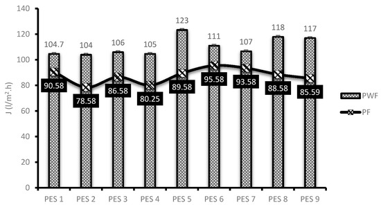 Membrane performance evaluation was conducted as described in Section 2.5. Figure 5 depicts the original water flux (PWF) and flux of permeate AMD (PF) solutions for the nine synthesized PES/chitosan membranes. The membranes were pre-pressed with deionized water for 4 h to obtain a steady flux before commencing with actual flux determination. This was necessary to ensure complete immersion of water in the membranes. The highest PWF of PES/chitosan was measured as 123 L/m2·h for PES 5. The lowest was measured as 104 L/m2·h for PES 1. Observing the FTIR spectra of the membranes reported on Figure 2, they all had similar surface chemistry; however, the PWF results varied. This variation could be attributed to the difference in degree of deacetylation of chitosan samples (Table 4) used in the blend to synthesis the membranes. Membranes blended with chitosan having the highest degree of deacetylation reported high PWF and those with low degree of deacetylation reported low PWF. A high degree of deacetylation implies a large number of amines groups exposed after the deacetylation process. The high PWF with a high degree of deacetylation was attributed to the number of amines groups which favored sorption of water molecules inside the membrane matrix. Moreover, contact angle and porosity results presented in Figure 3 corroborated that hydrophilic nature of the membranes and porosity had a positive impact on the membranes PWF. Membranes with high degree of hydrophilicity and porosity reported high PWF.