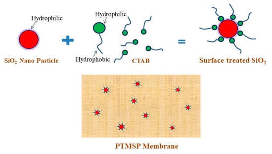 The mixture of 5% wt modified SNPs were blended with PTMSP using tert-butyl methyl ether (MTBE, min. 99.8%, Lach-ner, Neratovice, Czech Republic) via ultra-sonication for 30 min at 30% power in pulse mode (2.5 s pulse and 0.5 s pause) and stirring for 24 h using the magnetic stirrer to form a uniform suspension. The solution was then cast on a Petri dish, and the solvent was allowed to evaporate slowly over the next 48 h at room temperature. The thickness of the membrane was measured using a dial comparator (Somet, Teplické předměstí, Czech Republic). The membrane was soaked in methanol (p.a., Penta) overnight and then dried in the ambient air before its use to rejuvenate its physical structure [28].