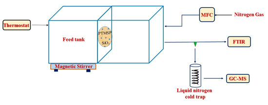 Pervaporation (PV) experiments were conducted using the previously published apparatus [26]; the schematic diagram of the system used to carry out the pervaporation experiments is shown in Figure 2. The apparatus consisted of 2 detachable cells made from duralumin. The left part of the cell (Figure 2) holds the feed solution at atmospheric pressure (average 98 kPa), and through the right part, the sweep gas (nitrogen) was conducted to the PTMSP-based membrane fixed between the 2 parts; the effective membrane area was 2.3 cm2. The left-side cell was provided with an inlet for temperature measurement and changing feed concentrations. All the experiments were performed at 37, 50, and 63 °C temperature with 1.5, 3.0, and 4.5 g of 1-butanol in 100 mL of water at 4 different time intervals. The feed solution was stirred during the pervaporation runs with a magnetic stirrer (250 rpm). The cells were double-jacketed and maintained at a constant temperature using a Huber Ministat 125 (Berching, Germany) water thermostat. Nitrogen was used as stripping/sweep gas with a constant flow rate of 75 STP/min by digital mass flow controller (DFC) (Aalborg, Orangeburg, NY, USA). The permeate was condensed and collected in a liquid nitrogen trap, and the permeation rate was determined from the weight of the collected samples using an Ohaus DV215CD balance (Nänikon, Switzerland) [29]. The molar fractions of 1-butanol and water in the feed and permeate were analyzed through gas chromatography.