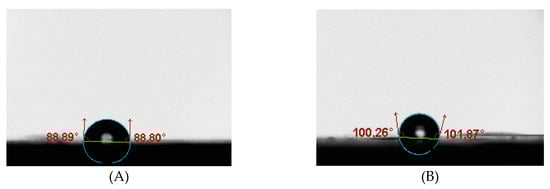 Contact angle measurement (A) Pure PTMSP membrane. (B) Hybrid membrane.