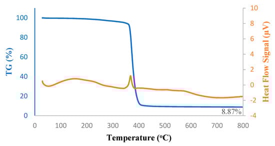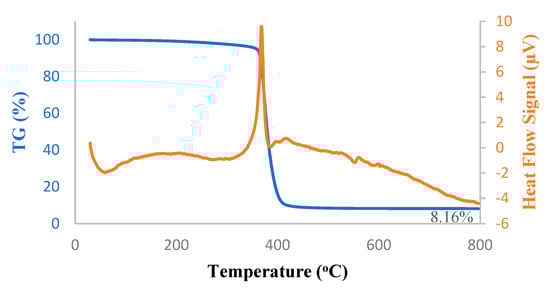 Thermal decomposition kinetics and stability of the hybrid PTMSP membrane, as well as that of pure PTMSP membrane, were investigated using TG-DSC under a nitrogen atmosphere; results are shown in Figure 5 and Figure 6. The melting peak onset arose steadily from 200 °C. Above 300 °C, the major decomposition-isomerization peak started and reached the peak melting point at 400 °C. At 800 °C, only 8.1 wt% of pure PTMSP and 8.8 wt% of hybrid PTMPS remained, which was in good agreement with the addition of 5 wt% SNPs to the membranes. From the DSC peaks, the melting took place at 370 °C in both pure and hybrid membranes. In the case of the hybrid membrane, the heat of this decomposition was lower due to the SNPs.