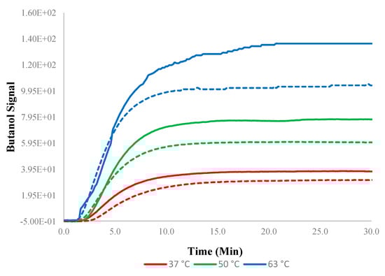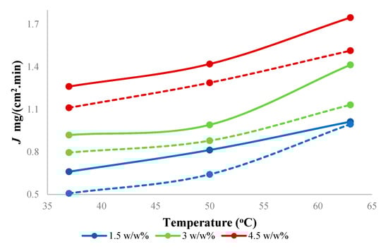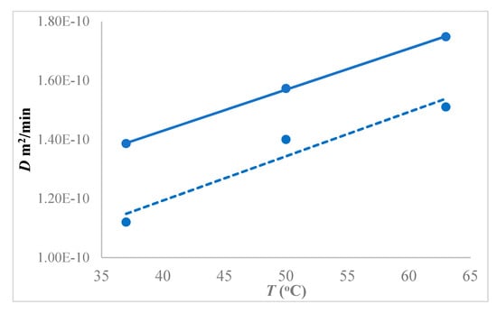The diffusivity of 1-butanol in the hybrid membrane increased with increasing temperature at 1.5 w/w% feed concentration, as shown in Figure 12. The diffusivity increased by 12.2% (from 1.39 × 10−10 to 1.57 × 10−10 m2/min) by changing temperature from 37 °C to 50 °C, whereas it increased by 24% (from 1.39 × 10−10 to 1.74 × 10−10 m2/min) by changing temperature from to 37 °C to 63 °C, all for the 1.5 w/w% 1-butanol concentration in the feed. When compared to the neat membrane, the hybrid PTMSP showed 15% higher diffusivity of 1-butanol at 1.5 wt% feed concentration than pure PTMSP.