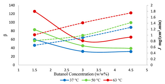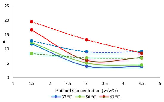 The value of α naturally depends on the units used for permeability; mass-based units were used in this work. The thermodynamics of the 1-butanol solutions, which was used in Equation (3), was modeled using the NRTL model [32] with parameters taken from the literature [33].