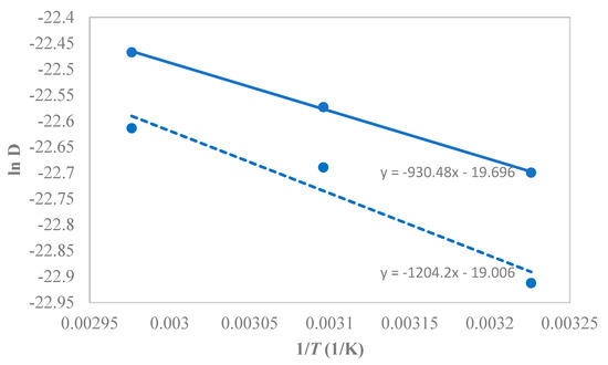 Arrhenius-type plot for the temperature dependence of the 1-butanol diffusivity in PTMSP-SNPs and neat PTMSP membranes at 1.5 w/w% feed 1-butanol concentration. The solid line represents the hybrid PTMSP-SNPs membrane and dotted lines for the neat PTMSP membrane. Data for pure PTMSP were taken from the literature [26].