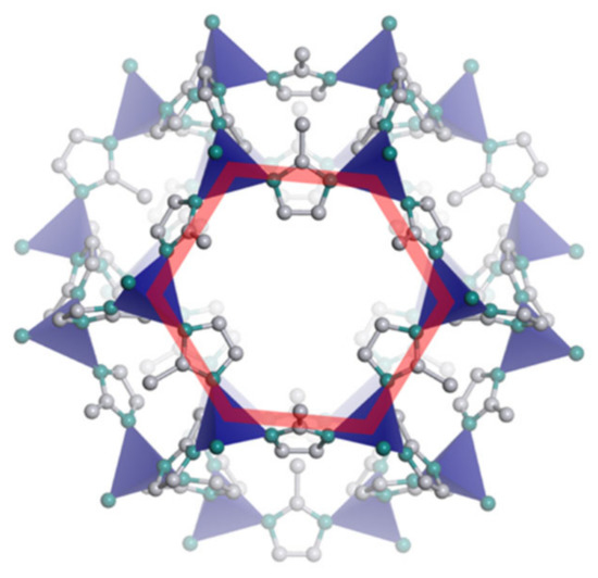 The commercial sieve selected to produce the MMMs was ZIF-8 (Basolite® Z1200, Cat. 691348 produced by BASF). In Figure 1, the structure of ZIF-8 is shown. Table 2 summarizes the physical properties, structure, and composition of ZIF-8. The company provided particle size information for ZIF-8, which had a D50 of 4.90 µm. No further grinding was performed on the fillers used to produce MMMs, because the results showed that only small decrements of the particle size could be obtained after the milling process, which is quite invasive and might break the crystalline structure of the materials. Figure 1 highlights the six-membered ring in red, in which the six ZnN4 tetrahedra, represented in blue, are connected to one another through organic linkers of 2-methylimidazolate. Carbon atoms are shown in grey, nitrogen atoms are shown in green, and hydrogen atoms are not represented.