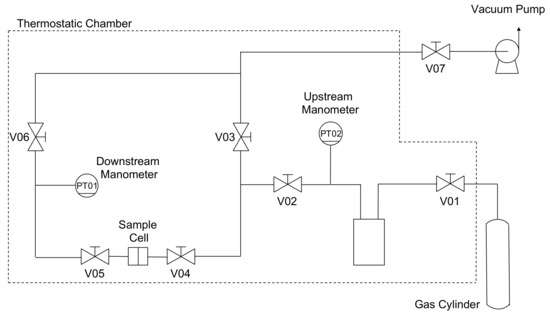 The permeability of He, N2, CH4, and CO2 was evaluated at different temperatures (i.e., 35, 50, and 65 °C) for pure PPO and MMMs at different loadings of the filler up to 45 wt% of ZIF-8. All gases were purchased from S.I.A.D. Spa (Bergamo, Italy) with a purity of or above 99.99% and used as received. The order in which gases were tested was as follows: He, N2, CH4, and CO2. This was pursued to prevent any conditioning effect of the sample, as PPO undergoes plasticization when exposed to high pressures of CO2 [70,71,72]. Each permeability experiment was performed at an absolute upstream pressure of 1.3 bar; thus, the pressure was low enough to prevent the plasticization effect. However, to make sure that the membrane permeability was unchanged after tests with CO2, the helium permeability was measured again at the same conditions. To investigate the effect of the temperature at different loadings of the sieve, the permeability of the four gases was evaluated at 35 °C, 50 °C, and eventually 65 °C for the same sample, avoiding any difference due to the change of the membrane. The fixed-volume variable-pressure manometric technique previously described elsewhere [73] was implemented to perform the experiments. The essential layout of the equipment is shown in Figure 2.