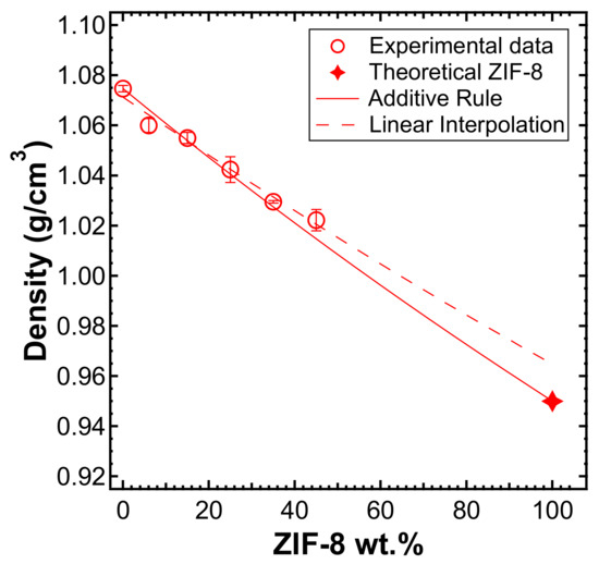 The density values of pure materials and composite membranes versus filler content are reported in Figure 4. The density of the MMMs decreased when increasing ZIF-8 loading. By plotting the same data in terms of the specific volume of each film as a function of weight filler loading, the expected linear correlation () was obtained with a correlation coefficient of R2 = 0.98 (represented with a dashed line in Figure 4). Hence, it was possible to estimate the density of ZIF-8 by extrapolating the linear function. Surprisingly, the ZIF-8 density was 0.96 g/cm3, which is a value very close to that of the theoretical density of the regular ZIF-8 crystal, i.e., 0.93–0.95 g/cm3 [49,55,61]. This may indicate that the presence of voids inside the MMMs is negligible, since interfacial adhesion defects would be detected by the lower-than-ideal values of density of the membranes. The additive rule for composite materials is shown in (8):