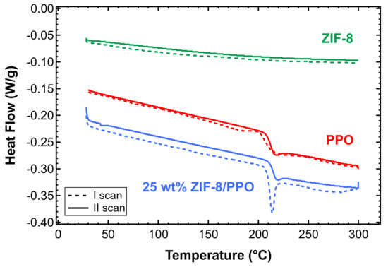 DSC analysis was carried out in two subsequent runs on films of PPO, ZIF-8 powder as received, and mixed-matrix films, between 25 and 300 °C. Figure 6 shows that the pure PPO films obtained via solvent casting in chloroform at 50 °C were fully amorphous, as they showed the typical glassy transition peak at about 213 °C, consistent with literature values, in both scans [50,53]. It must be noted, however, that slower casting at room temperature (i.e., complete evaporation in 3 days) results in the formation of semi-crystalline PPO samples, as verified via DSC analysis (Figure S2a), and rupture of the membrane during film formation (Figure S2b). A specific analysis was carried out in this work on the effect of the casting temperature on the final properties, although it is not reported here because it is beyond the scope of the paper. The value of 50 °C appears to be the optimal one for producing robust and amorphous PPO films. There is almost no difference between the first and second scan in the amorphous PPO, because the sample was previously treated at 200 °C under vacuum, proving that the treatment can remove any residual solvent.