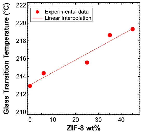 Trend of the glass transition temperature in ZIF-8/PPO MMMs as a function of the filler loading.