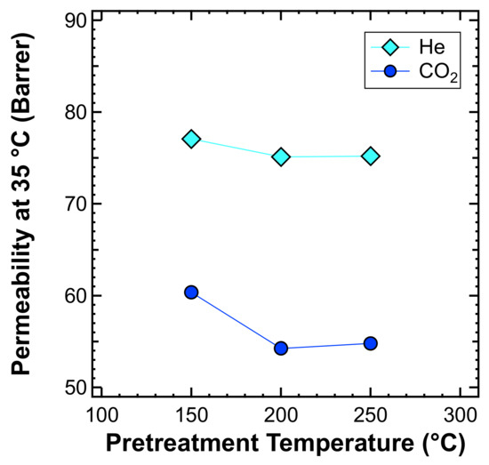For these reasons, whenever starting a comprehensive experimental campaign on a glassy membrane system, it is necessary to stabilize the membrane properties. We carried out a specific study to locate the minimum annealing temperature required to reach a stable permeability and solvent-free films. The study was carried out by measuring the permeability of He and CO2, at 35 °C, after thermal treatment carried out under vacuum at various temperatures, from 150 to 250 °C, overnight. The results of gas permeability plotted against the pretreatment temperature are reported in Figure 8. It shows that the permeability decreased when increasing the treatment temperature, due to the accelerated aging induced by such high temperatures, and reached a plateau at a temperature of 200 °C, which is also below the of PPO. Therefore, such tests allowed us to identify the optimal treatment temperature as being equal to 200 °C.