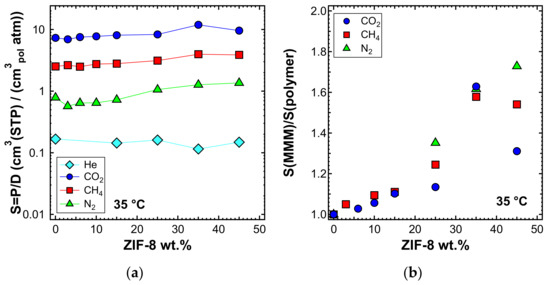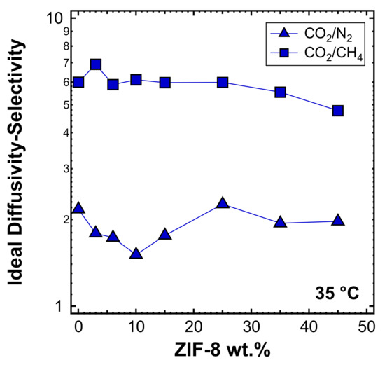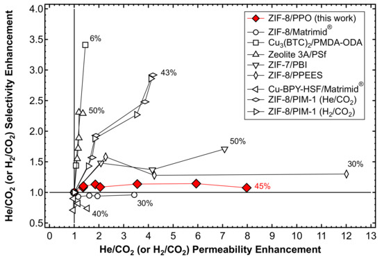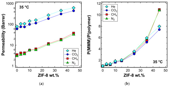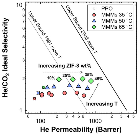 Pure gas permeability tests with He, N2, CH4, and CO2 were performed for several membranes at 35 °C, covering the whole range of filler loadings investigated, namely 0%, 3%, 6%, 10%, 15%, 25%, 35%, and 45% by weight. Figure 9 shows that the permeability increases monotonously with the filler loading. The permeability enhancement is extremely high and, in particular, adding 45 wt% of ZIF-8 to PPO enhances the He permeability by a factor of about 8. Table 4 presents the ideal selectivity for relevant gas pairs (i.e., He/CO2, CO2/N2, CO2/CH4, He/CH4, and He/N2), evaluated by means of Equation (3). The uncertainty of the calculated permeability primarily originated from the variation of membrane thickness. However, the overall variability was always kept within ±3% for MMMs up to 25 wt% and within ±8% for higher loadings.