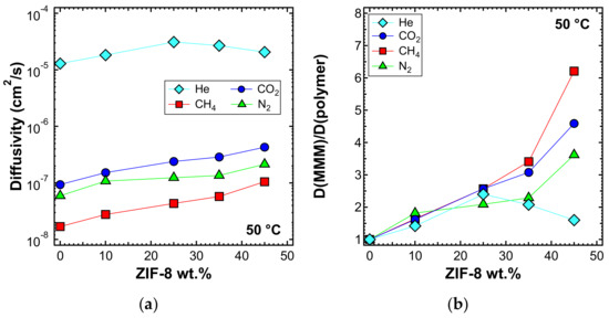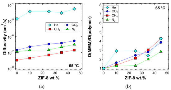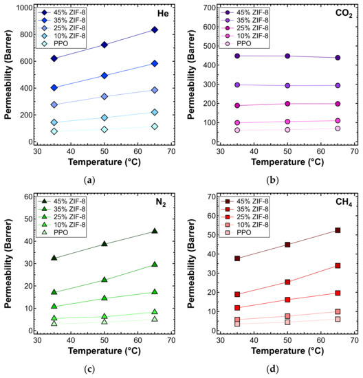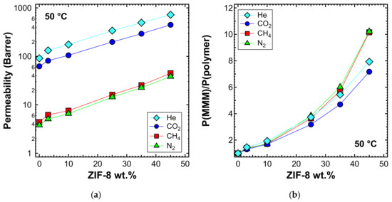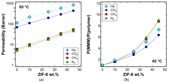 Permeability tests were also performed at 50 and 65 °C for a selected list of MMM samples. When viewing the behavior at different temperatures, one can notice that the qualitative trends were similar, albeit with generally higher values of permeability, which are shown in Figure 11a (50 °C) and Figure 12a (65 °C). The relative increase of permeability, which is displayed in Figure 11b (50 °C) and Figure 12b (65 °C), was slightly lower than what was observed at 35 °C in Figure 9a. In particular, we noticed that at higher temperatures, the effect of adding ZIF-8 on the permeability is around the same for He and CO2, while less marked for N2 and CH4.