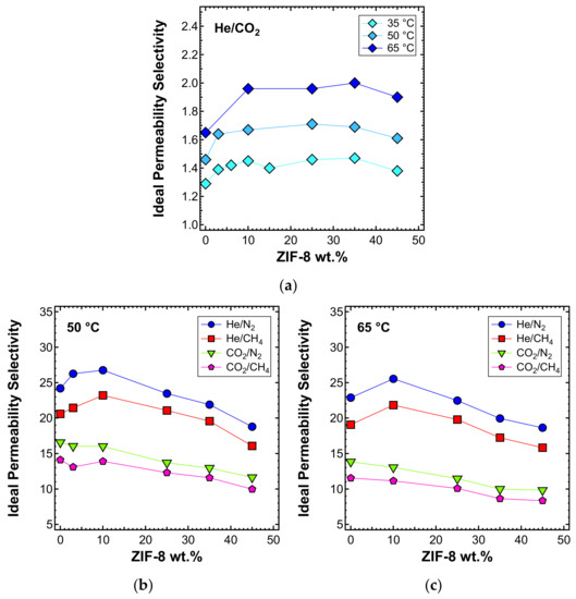 Ideal selectivity for (a) He/CO2 at 35, 50, and 65 °C and other gas couples at (b) 50 and (c) 65 °C in ZIF-8/PPO MMMs, with an upstream pressure of 1.3 bar.