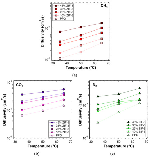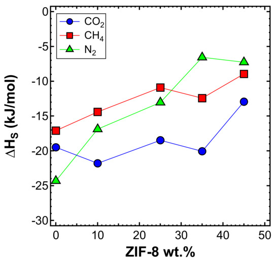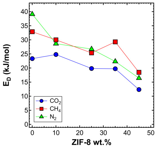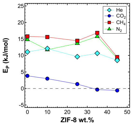 where is the activation energy of the diffusion process, which is the barrier that needs to be overcome by a gas molecule to make a diffusive jump from one cavity to another, and is the temperature-independent pre-exponential term, which represents the diffusion coefficient at an infinite temperature. Similar considerations hold for permeability, with the essential difference that permeation is not a thermally-activated process, since permeability is a combination of a kinetic and thermodynamic factor, and both increasing and decreasing trends can be experienced as a function of temperature. However, the energetic constant of permeation, , can be calculated by means of (5), and the pre-exponential factor, , as for diffusion, is temperature-independent and represents the permeation coefficient at an infinite temperature. Proper fitting provides the possibility to extrapolate experimental permeability and diffusivity values at higher temperatures than those investigated. This is very useful information, since these MMMs might be required to work at a high temperature, with H2/CO2 separation favored under those conditions and materials compatible with such a high temperature. Eventually, the heat of sorption, , of each gas in the MMMs can be calculated by simply subtracting the two contributions as follows: