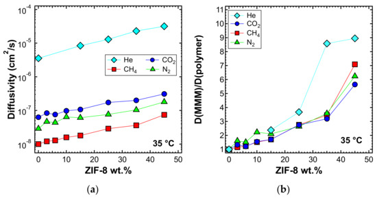 (a) Permeability and (b) relative permeability increase of various gases at 35 °C with an upstream pressure of 1.3 bar in ZIF-8/PPO MMMs.