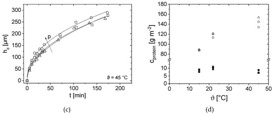 Experimental results are compared at the three different pressures for a given temperature (Figure 6) and then vice versa (Figure 7) to allow an easier interpretation of the influence of p and ϑ. The deposit thickness hd according to Equations (1) and (2) was determined as a function of filtration time t for each filtration pressure and temperature combination (p, ϑ) (Figure 6 and Figure 7). In dead-end mode, the thickness increases with time for all (p, ϑ) in the hollow fibre because more retained proteins accumulate on the membrane surface. At the beginning of filtration, for the first 35 min, the deposit layer height is similar for all three filtration pressures. A small pressure-dependence can only be observed at ϑ = 45 °C. The deposit layer height therefore seems to be almost pressure-independent for the first 35 min (Figure 6c).