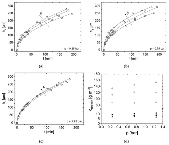 The measurements at p = 1.25 bar show almost a temperature independence for t < 75 min (Figure 7c). A small difference in deposit height can only be measured for t > 100 min. Concluding, the influence of temperature seems to be less at higher pressures. The pressure probably is so high that structural changes of the milk proteins dominate the process leading to almost no influence of temperature on the overall deposit layer height.