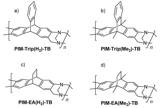 - Budd, P.M.; Ghanem, B.S.; Makhseed, S.; McKeown, N.B.; Msayib, K.J.; Tattershall, C.E. Polymers of intrinsic microporosity (PIMs): Robust, solution-processable, organic nanoporous materials. Chem. Commun. (Cambridge, UK) 2004, 2, 230–231. [Google Scholar] [CrossRef]