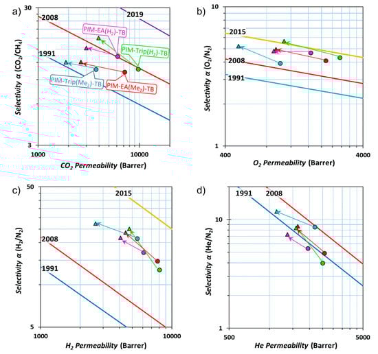 - Comesaña-Gándara, B.; Chen, J.; Bezzu, C.G.; Carta, M.; Rose, I.; Ferrari, M.-C.; Esposito, E.; Fuoco, A.; Jansen, J.C.; McKeown, N.B. Redefining the Robeson upper bounds for CO2/CH4 and CO2/N2 separations using a series of ultrapermeable benzotriptycene-based polymers of intrinsic microporosity. Energy Environ. Sci. 2019, 12, 2733–2740. [Google Scholar] [CrossRef]