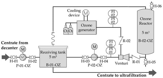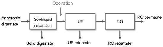 The membrane-driven nutrient recovery process consists of three process units: solid/liquid separation, ultrafiltration, and reverse osmosis (Figure 1). A detailed description of the process and operational results can be found in Gienau et al. (2018) [11]. The focus of this study is the improvement of the UF filtration performance by ozone treatment of the UF feed (liquid digestate fraction, hereinafter called “centrate”) and its influence on nutrient recovery.