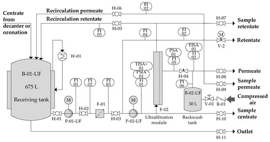 Figure 3 shows the ultrafiltration pilot plant (A3 Water Solutions GmbH). The feed to the ultrafiltration pilot plant came either directly from the decanter centrifuge (reference samples) or from the receiving tank from the ozonation plant (ozone-treated samples). Pilot plant operation and data capture was fully automated. Calculation of permeate flux and recovery was according to Equations (1) and (2). Operation of the UF pilot plant was quasi-continuous—a centrate batch was continuously processed during working hours and operation was stopped during nights and weekends. The UF permeate was further treated in a three-stage reverse osmosis unit.
