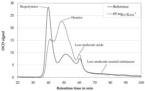 In a first step, digestate centrates of different biogas plants were treated with ozone dosages of 20–150 mgO3∙goDM−1. With a mean organic fraction of 20 goDM∙L−1 this amounts to ozone concentrations of 0.04–3 gO3∙L−1. Related to the COD concentration in the centrates of 25–60 gCOD∙L−1, the under-stoichiometric ozone treatment could only result in an oxidation of small fractions of the total organic material. Optically, these low ozone dosages did not result in a decolorization of the generally brown color of the centrates. Nevertheless, ozone treatment changed the fluid properties. Figure 4 gives the LC-OCD analyses of original centrate (reference) and centrate treated with a medium specific ozone dosage of 69 mgO3∙goDM−1ozone. The first peak of the reference sample arrives at the organic carbon detector at about 38 min after sample injection. It contains biopolymers, i.e., polysaccharides, proteins, and organic colloids. It is followed by a second peak at 50 min, which contains humic substances. The third peak at 61 min is due to the operating conditions (no adjustment of the sample pH and ionic strength of the eluent) and contains organic acids. Concentrations of the different fractions are proportional to areas under the curves. For unknown biological suspensions, it is difficult to distinguish the transitions between the different peaks, though. Therefore, the analysis within this paper is limited to a qualitative analysis instead of a quantification. Research on membrane bioreactors has proven a strong correlation between the biopolymers peak and membrane fouling [5].