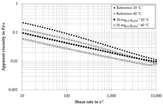 The influence of ozone treatment was tested for digestates of different biogas plants with specific ozone dosages between 20 and 150 mgO3∙goDM−1. Even very low specific ozone concentrations of 20–30 mgO3∙goDM−1 were found to decrease apparent viscosities. For economic and environmental reasons, low ozone dosages of 20 and 30 mgO3∙goDM−1 were further investigated. Figure 5 shows the example of viscosity curves of a centrate from an agricultural biogas plant with an ozone treatment of 30 mgO3∙goDM−1 and without ozone treatment. The levels of apparent viscosities are well above water viscosity (ηwater = 0.001 Pa∙s, 20 °C). All samples are characterized by a shear-thinning rheological behavior: with increasing shear rate, the apparent viscosity of the samples decreases. The increase of the curves for very high shear rates can be explained by the occurrence of Taylor vortices. As the samples are optically free of structural material, both the elevated apparent viscosity level and the pseudoplastic behavior can be explained by the high presence of biopolymers, i.e., the long-chained molecular structure of polysaccharides. For both temperatures, ozone-treated samples show a lower value of apparent viscosity. This is in good accordance with the lower value of biopolymers: the reduction of biopolymer chains reduces the level of apparent viscosity as well as the shear thinning properties.