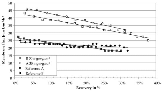 Figure 6. Membrane flux (laboratory ultrafiltration rig) of digestate centrates of two agricultural biogas plants with ozone treatment and without (reference) as a function of recovery, Δp = 1.15 ± 0.01 bar, v = 2.46 ± 0.08 m∙s−1, T = 47.7 ± 1.4 °C
