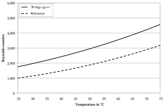 Figure 8. Calculated Reynolds numbers of digestate centrates with ozone treatment and without (reference) as a function of temperature, v = 4.6 m∙s−1, d = 3.3 mm, rheological parameters according to Table 2.