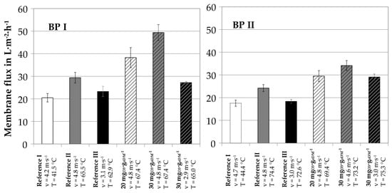 Figure 9 shows the accumulated results of flux rates for reference and ozone-treated samples at different operational conditions. The results were obtained with the pilot plant at the site of two different full scale biogasplants (BP I and BP II).