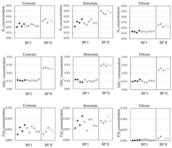 The complete conditioning process produces four different fractions. The solid fertilizer contains most of particulate organic material, phosphorous and organic nitrogen. The second fraction is the retentate of the ultrafiltration step, which contains all soluble nutrients and some organic substances, e.g., biopolymers. This fraction is usually recirculated to the biogas plant. The third fraction is a particle free concentrated liquid fertilizer, which contains most of the potassium and ammonium. The last fraction is water. Dependent on the RO design, it can be treated to discharge or process water quality. Figure 10 gives the mean dry mass and nutrient concentrations in the different process streams over the whole operation time of the pilot plant at BP I and BP II, respectively.