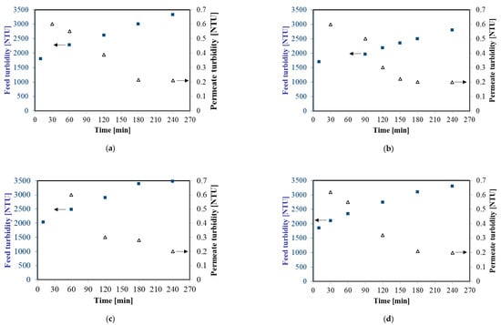 Changes of feed and permeate turbidity during cross-flow MF process, Transmembrane Pressures (TMP) = 0.08 MPa. (a) 250 dm3/h; (b) 500 dm3/h; (c) 750 dm3/h; and (d) 1000 dm3/h.