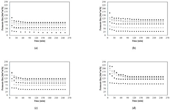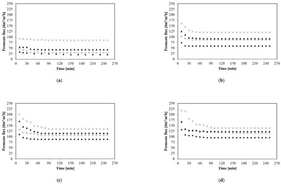 Effect of transmembrane pressure on the permeate flux. (a) 250 dm3/h; (b) 500 dm3/h; (c) 750 dm3/h; and (d) 1000 dm3/h. TMP [MPa]: ◆ 0.02, ○ 0.04, ▲ 0.06, × 0.08, □ 0.10, and ● 0.12.