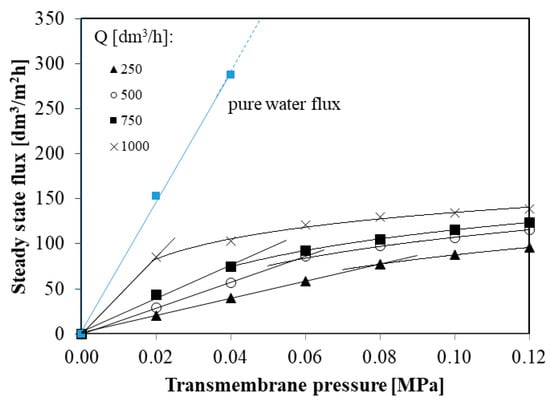 It is worth noting that for each feed flow rate (from 250 to 1000 dm3/h) the steady state permeate flux depends linearly on the transmembrane pressure until the critical flux Jcrit is reached. Above Jcrit permeate flux increases more slowly in function of TMP. Since the relation between permeate flux and TMP relationship is below that of the pure water (Figure 5), the critical fluxes obtained in the present study correspond to the weak form of critical flux which has been defined in [33,57]. Weak form of the critical flux has also been reported in several previous studies [17,69,70].