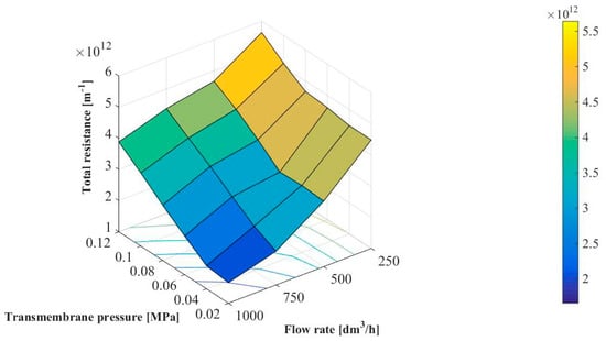Figure 7 shows the effect of transmembrane pressure and feed flow rate on the total hydraulic resistance. It has been demonstrated that values of RT were in the range between 1.66 × 1012 and 5.64 × 1012 m−1. The same RT order of magnitude has been previously reported in [14,25,37] where the microfiltration of various bacterial media by using ceramic membranes has been investigated. For example, Head and Bird [37] have demonstrated that the total hydraulic resistance during MF of milk (1.0 × 104–1.0 × 105 CFU/mL) with a tubular Al2O3-membrane (the pore size diameter of 12 µm) was in the range from 1.43 × 1012 to 2.62 × 1012 m−1.