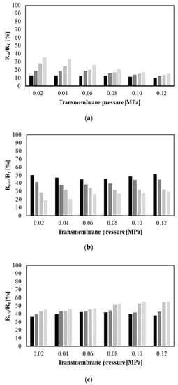 In turn, Figure 8 shows the relative percentages of hydraulic resistances (membrane Rm (a), reversible fouling Rrev (b) and irreversible fouling Rirr (c)) as a function of TMP for four different feed flow rates (from 250 to 1000 dm3/h). The relative percentage of membrane hydraulic resistance was in the range from 10.36% (for 0.12 MPa and 250 dm3/h) to 35.22% (0.02 MPa and 1000 dm3/h). In general, percentage of Rm (values up to 15%) was negligible compared with the Rrev and Rirr resistances for TMP equal to 0.12 MPa and Q equal to 250 dm3/h. This observation indicates that the percentage of membrane hydraulic resistance increases with decreasing of transmembrane pressure and increasing of the feed flow rate. The same observation has been reported in previous studies [14,25].