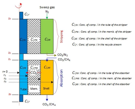 The transport of the regenerated solute gas (CO2) and the sweep gas (N2) components in the membrane section restrained between and can be designated by the material balance equation (Equation (34)), where diffusion is the only transport mechanism in the membrane phase []:
