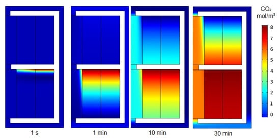 The surface plot of CO2 concentration across the membrane modules (absorption/stripping) is predicted in Figure 3. The inlet concentration of CO2 that enters the shell side of the absorption unit (bottom) is 8 mol/m3, and initial fresh solvent concentration (0.5 M PG) exists in the tube side. The CO2 being absorbed in the absorption unit with the PG solvent. The absorption efficiency declined with time. Initially, the CO2 concentration is the inlet of the membrane (absorber) shell side. With time (after 1 and 10 min), the percentage of CO2 absorbed dropped. The decreased in the absorption efficiency is due to the consumption of the PG solvent available for the absorption of CO2 in the hollow fiber lumen and the week regeneration of the rich PG in the stripping unit (top). After 30 min, almost no CO2 removal is observed in the absorber, the CO2 concentration across the absorber shell side is almost close to inlet concentration (8 mol/m3). This is attributed to the consumption of the available PG for the CO2 absorption and the week regeneration of the solvent.