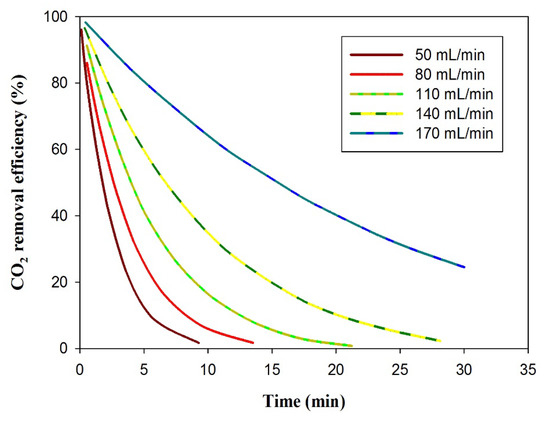 Effect of solvent initial feed rate (50, 80, 110, 140, and 70 mL/min) at constant gas feed rate (10 mL/min) on the CO2 removal efficiency with time.