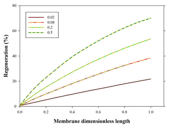 The influence of rich solvent inlet temperature on regeneration efficiency along membrane dimensionless length is illustrated in Figure 6. As the stripping temperature of rich solvent increases, stripping efficiency increases. That is accredited to the decrease of CO2 solubility in rich solvent with temperature; CO2 solubility is inversely proportional to the temperature of solvent. At high temperatures, the dissolved CO2 in the rich solvent escapes and increases the stripping driving force of CO2 mass transfer, and more CO2 released leads to higher CO2 stripping efficiency [].