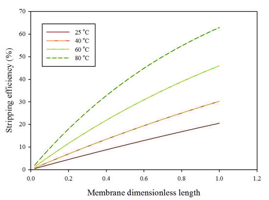 Stripping efficiency versus membrane dimensionless length at variable liquid solvent temperatures (25, 40, 60, and 80 °C); inlet gas flow rate is 600 mL/min and flow rate of inlet solvent is 20 mL/min.